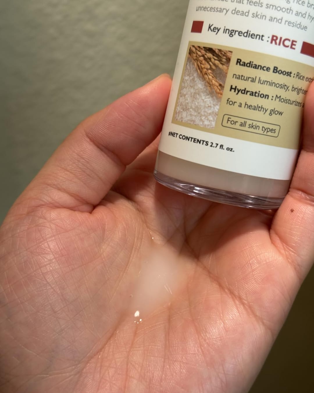 Weißer Reis Peel Shot enthält Reiskleie-Wasser (Oryza Sativa, 640.000 ppm), Dipropylenglykol, Wasser, Tripropylenglykol, Cellulose, Propandiol, Butylenglykol, 1,2-Hexandiol, Carbomer, Steartrimonium Methosulfat, Glycerin, Saccharide Isomerat, Isopropylalkohol, Hydroxyacetophenon, Glycereth-25 PCA Isostearate, Cetyl Ethylhexanoate, Ethylhexyl Palmitate, Squalan, Ethylhexylglycerin, Sucrose Distearate, Caprylic/Capric Triglyceride, hydrolysiertes Gardenia Florida-Extrakt, hydrolysiertes Malzextrakt, hydrolysiertes Stiefmütterchen-Extrakt (Viola Tricolor), Disodium EDTA, Parfüm, hydriertes Lecithin, Hyaluronsäure, hydrolysierte Hyaluronsäure, Natriumhyaluronat, Niacinamid, Reiskeimextrakt, Zitronensäure, Natriumcitrat, Coptis Japonica-Wurzelextrakt, Kakaosamenextrakt (Theobroma Cacao), Dextrin, Arbutin, Gluconolacton und Salicylsäure.